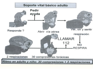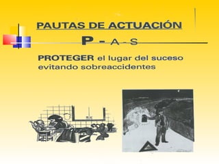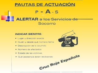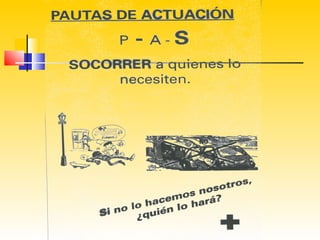 Este documento proporciona información sobre los primeros auxilios. Explica que los primeros auxilios consisten en prestar cuidados iniciales a una víctima hasta la llegada de ayuda médica especializada. Se debe actuar con tranquilidad y seguir unas pautas como proteger el lugar, alertar a los servicios de emergencia y socorrer a las víctimas. También describe cómo tratar heridas, hemorragias, paradas cardíacas y otras emergencias médicas.