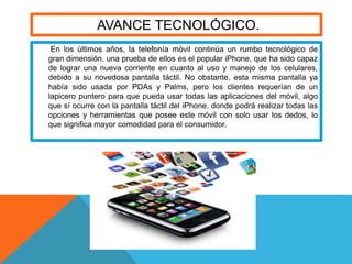 El documento describe los avances tecnológicos en teléfonos celulares, incluyendo la popularización de las pantallas táctiles a través del iPhone y mejoras en la duración de baterías. También discute cómo los celulares se han convertido en medios de entretenimiento e integran funciones de laptops de forma portable. Entre los equipos más costosos se mencionan el iPhone y otros modelos innovadores con pantallas táctiles y múltiples aplicaciones.