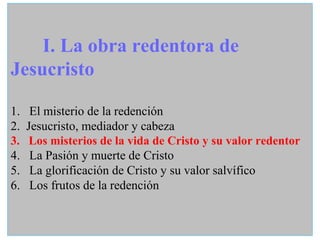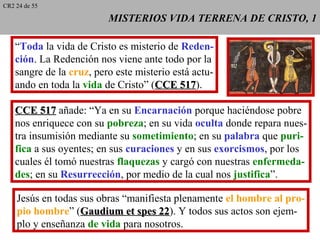 Este documento describe los misterios de la vida terrena de Jesucristo y su valor redentor, incluyendo su Encarnación, Nacimiento, Presentación en el Templo, vida ordinaria, ministerio público con predicaciones y milagros, y cómo a través de estos actos Jesús manifiesta plenamente al hombre y redimió todas las realidades de la vida humana.