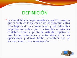 La contabilidad computarizada permite registrar de forma sistemática y automatizada las operaciones contables de una organización. Ofrece ventajas como velocidad, reducción de errores y obtención oportuna de información, aunque también implica costos y la necesidad de personal para analizar la información. Los sistemas de información contable usan personal, registros y procedimientos para cubrir las necesidades de información financiera de una organización.