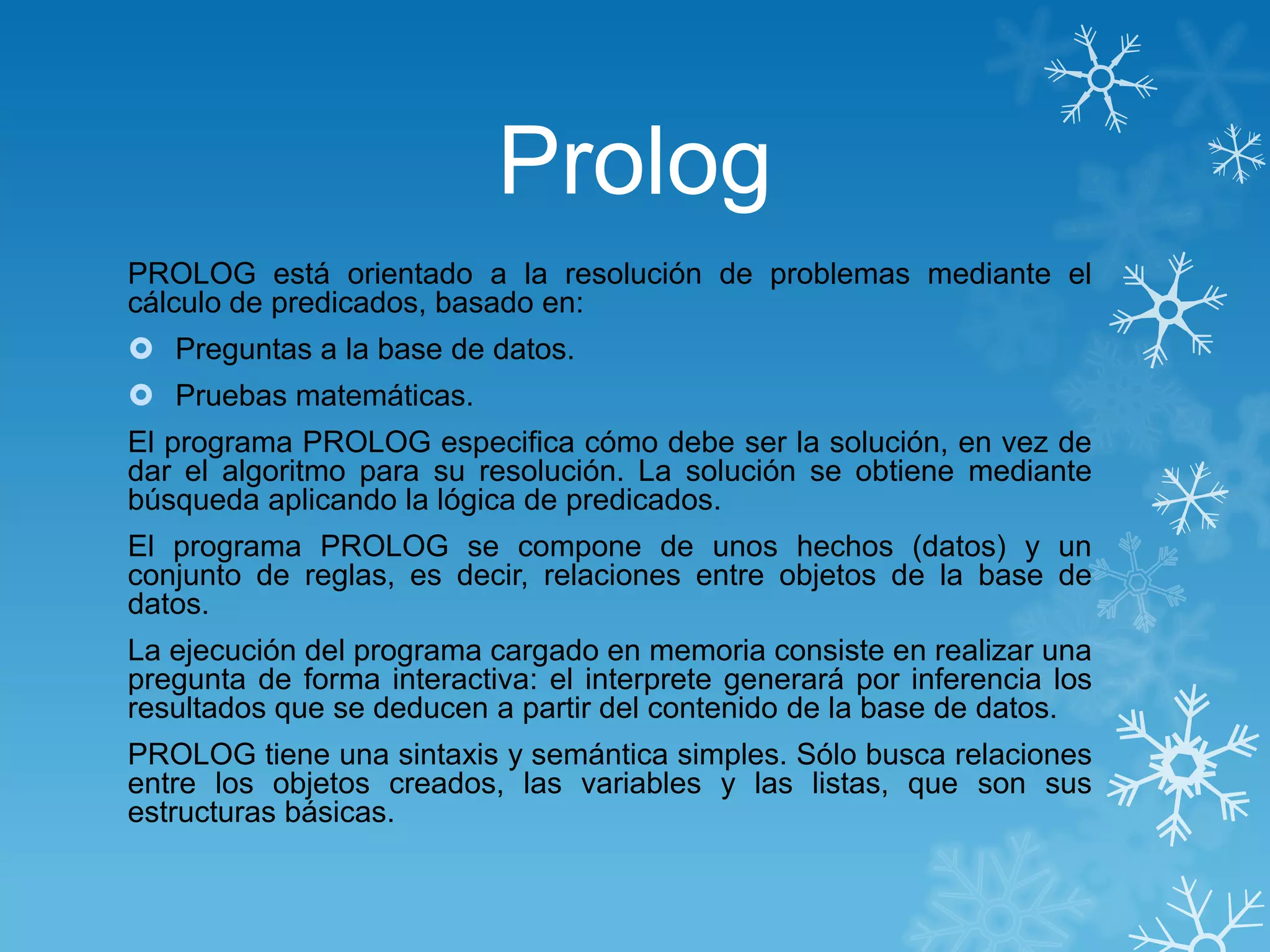 PROLOG, LISP y CLIPS son lenguajes de programación orientados a la resolución de problemas. PROLOG se basa en la lógica de predicados, LISP es funcional y se utiliza en inteligencia artificial, mientras que CLIPS es una herramienta para el desarrollo de sistemas expertos escrita en C para ser portable.