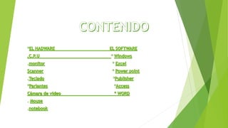 El documento habla sobre los componentes físicos y lógicos de una computadora. Describe los principales dispositivos físicos como la unidad central de procesamiento, pantalla, teclado, mouse, bocinas y escáner. También menciona programas comunes como los de contabilidad, presentaciones, publicaciones, bases de datos y procesadores de texto. El propósito de la computadora es procesar y almacenar información para resolver problemas.