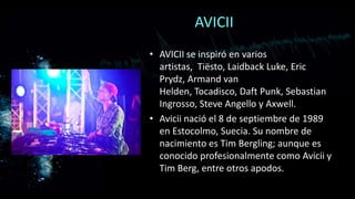 El documento presenta información breve sobre cinco artistas de música electrónica: Avicii, Nicky Romero, Hardwell, Showtek y NachoPelaez. Se proporcionan detalles sobre sus influencias musicales, lugar y fecha de nacimiento, descubrimiento de la música a temprana edad y éxito en la industria para Avicii, Nicky Romero y Hardwell. Para Showtek se indica que es un dúo holandés de hard dance formado por los hermanos Sjoerd y Wouter Janssen y que han tenido influencia en la