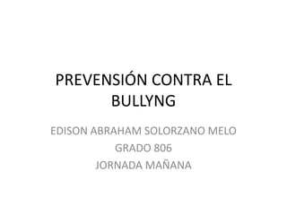 Edison Abraham Solorzano Melo presenta información sobre la prevención del acoso escolar o bullyng en 3 oraciones. Define el bullyng como cualquier forma de maltrato psicológico, verbal o físico y enumera algunos tipos como bloqueo social, hostigamiento, manipulación y exclusiones. Explica que se puede prevenir el bullyng informando a los mayores y denunciando a la policía si alguien es víctima de maltrato.