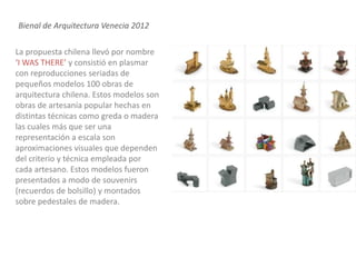 La propuesta chilenallevó por nombre ‘I WAS THERE’ y consistió en plasmar con reproducciones seriadas de pequeños modelos 100 obras de arquitectura chilena. Estos modelos son obras de artesanía popular hechas en distintas técnicas como greda o madera las cuales más que ser una representación a escala son aproximaciones visuales que dependen del criterio y técnica empleada por cada artesano. Estos modelos fueron presentados a modo de souvenirs (recuerdos de bolsillo) y montados sobre pedestales de madera. Bienal de Arquitectura Venecia 2012