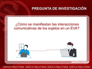 Este documento describe una investigación sobre las interacciones comunicativas de estudiantes en un entorno virtual de aprendizaje (EVA). El objetivo es develar cómo se manifiestan estas interacciones mediante el análisis del discurso y la observación de estudiantes en un curso virtual. Los resultados muestran que los estudiantes usan principalmente el chat para comunicarse y herramientas múltiples para trabajos grupales, y que un EVA puede contribuir a mejorar la escritura.