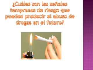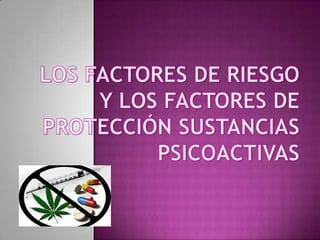 Este documento describe varios factores de riesgo y protección para el abuso de drogas. Los factores de riesgo incluyen conducta agresiva temprana, falta de supervisión de los padres, abuso de sustancias por parte de los compañeros, disponibilidad de drogas y pobreza. Los factores de protección incluyen autocontrol, monitoreo de los padres, aptitud académica, políticas anti-drogas en la escuela y un fuerte apego a la comunidad. Los padres, educadores y líderes comunitarios pueden usar esta