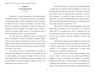 Este documento presenta un resumen del capítulo 17 del Evangelio de Juan, conocido como "la Oración del Señor". Jesús ora a Dios el Padre por sí mismo, por los once discípulos y por todos los creyentes. En la primera parte de la oración, Jesús pide ser glorificado y define la vida eterna como conocer a Dios y a Jesucristo. Luego ora por los discípulos, pidiendo protección y unidad para ellos. Finalmente ora por todos los creyentes futuros, para que sean uno como Jesús y el Padre