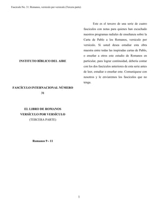 Este documento resume la tercera parte de una serie de fascículos sobre el libro de Romanos de la Biblia. Resume los capítulos 9-11 de Romanos, en los que Pablo expresa su gran amor y preocupación por su pueblo judío. Pablo enumera las ocho grandes ventajas espirituales que Dios les dio a los judíos, incluyendo la adopción, las promesas y el hecho de que Jesús vino a través de ellos. Pablo lamenta que muchos judíos no aceptaron a Jesús como el Mesías a pesar de estas