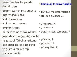 El documento lista varias actividades y pasatiempos como tener una familia grande, dormir bien, tocar un instrumento, jugar videojuegos, ir al cine e ir al parque. También incluye tareas como limpiar la casa y hacer la cama todos los días, así como deportes y gustos musicales. Ofrece preguntas y respuestas sobre opiniones, lugares y cultura.
