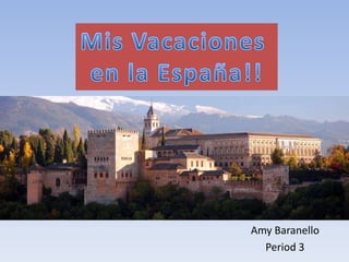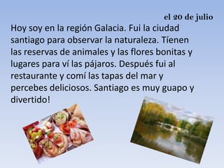 Este documento contiene los diarios de viaje de Amy Baranello durante una visita a varias regiones de España entre el 20 y 26 de julio. Describe sus visitas a ciudades como Santiago, Segovia, Zaragoza, Barcelona, Pamplona, Granada y Murcia, donde exploró la naturaleza, cultura y gastronomía locales, incluyendo actividades como montar a caballo, tomar clases de flamenco y asistir a corridas de toros.