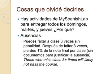 Este documento presenta un resumen del día 1 de la clase SPAN 232. Incluye una revisión de los temas de la clase anterior, actividades de MySpanishLab, normas de asistencia, y conversaciones sobre las vacaciones de invierno, la infancia, y la comida. También revisa la formación del pretérito, imperfecto, mandatos formales e informales.