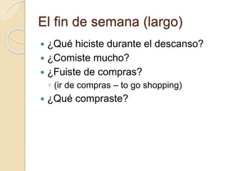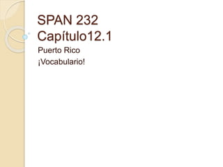 Este documento presenta información sobre Puerto Rico, incluyendo detalles sobre las ciudades de San Juan, Arecibo y Ponce. También discute temas como el sistema monetario de Puerto Rico, artistas puertorriqueños famosos, y los efectos del huracán María en septiembre de 2017. El documento también incluye vocabulario sobre actividades del fin de semana, compras y tecnología.