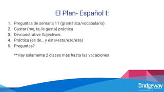 El documento presenta el plan de la clase de español de la semana 12, incluyendo preguntas de la semana 11, práctica con el verbo gustar, adjetivos demostrativos y práctica con es de. También incluye información sobre las dos clases restantes antes de las vacaciones y una presentación sobre adjetivos demostrativos en español.