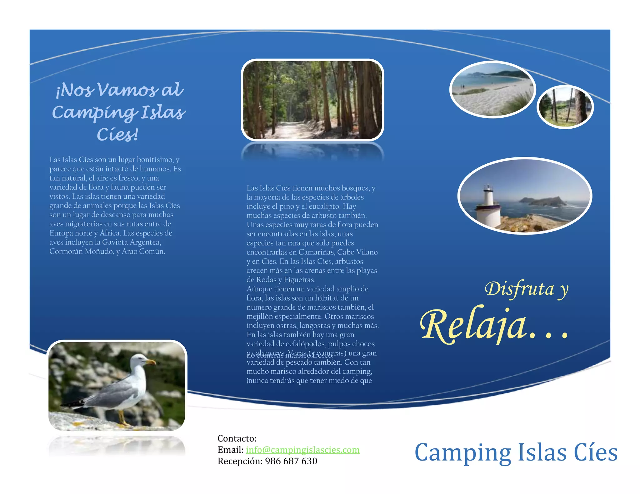 El documento describe un viaje de camping a las Islas Cíes de 4 días. Incluye visitas a poblados históricos y ruinas guiadas, pesca y buceo, observación de flora y fauna en bicicleta. El camping ofrece tiendas, fogatas y comidas frescas. El itinerario incluye transporte desde el aeropuerto a la isla y regreso.
