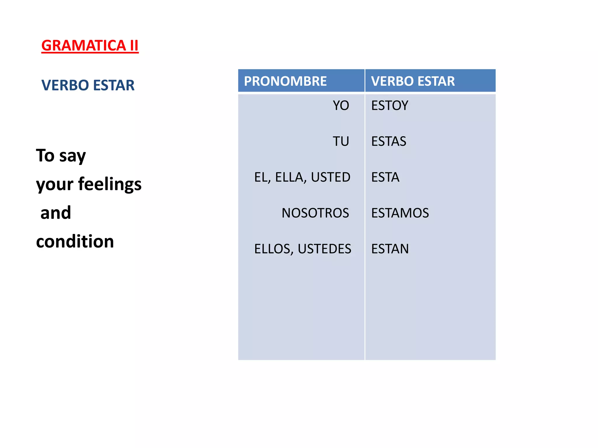 Este documento presenta una lección sobre el verbo estar en español y vocabulario relacionado con los sentimientos y la condición. Explica las conjugaciones del verbo estar para cada pronombre y proporciona ejemplos de adjetivos comunes que describen sentimientos como feliz, triste, enojado y confundido.