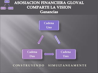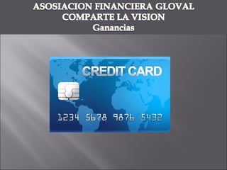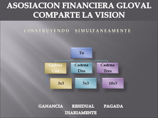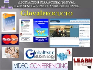El documento describe una asociación financiera sin fines de lucro llamada Gloval que tiene la misión de unir a individuos y organizaciones para enriquecer a otros en las dimensiones espiritual, social y financiera. Explica un programa de asociación sin fines de lucro que donará $5 por persona en los primeros 30 días. También describe un plan de referidos de 3 niveles que paga comisiones diarias y mensuales a los participantes.