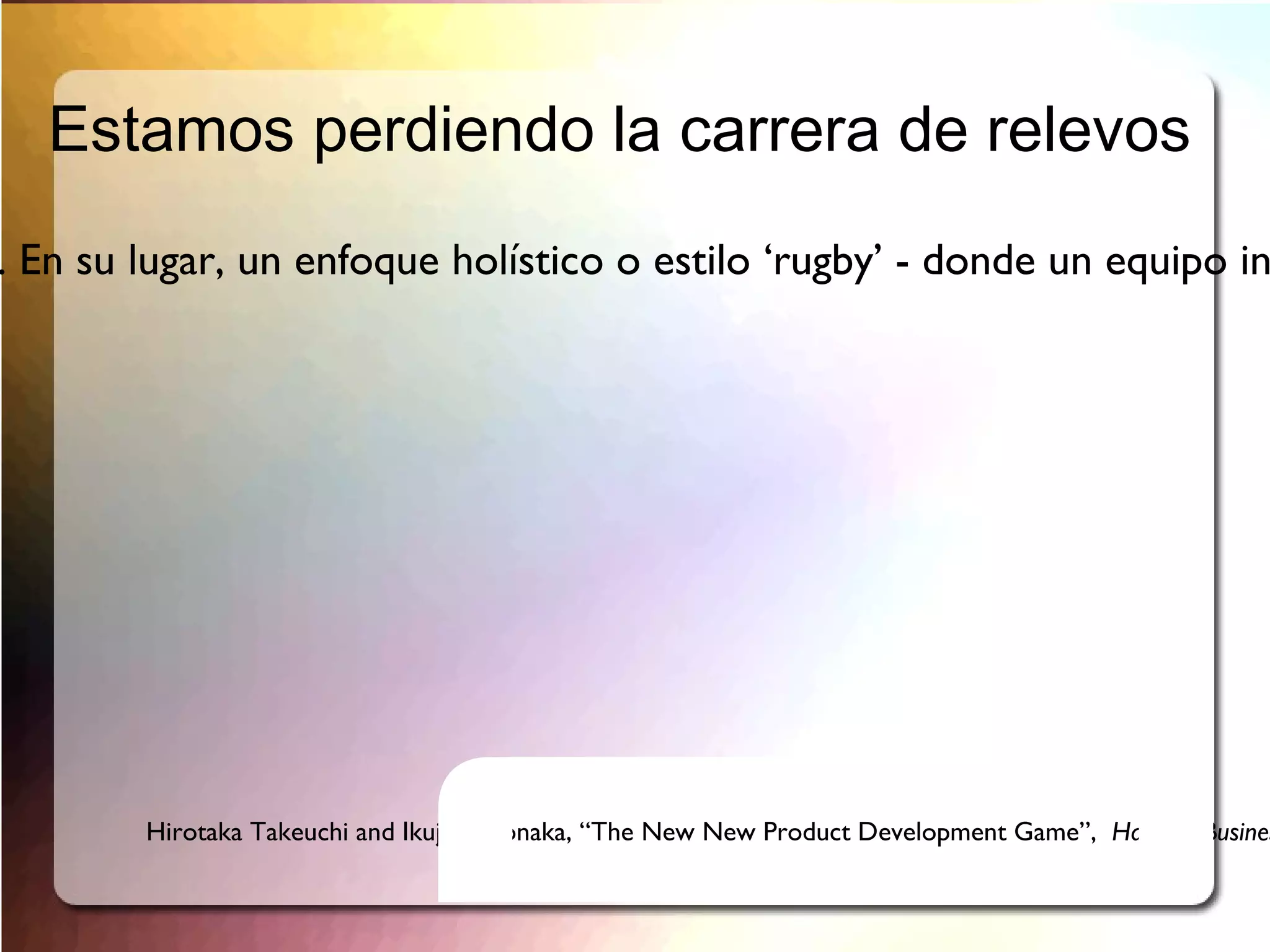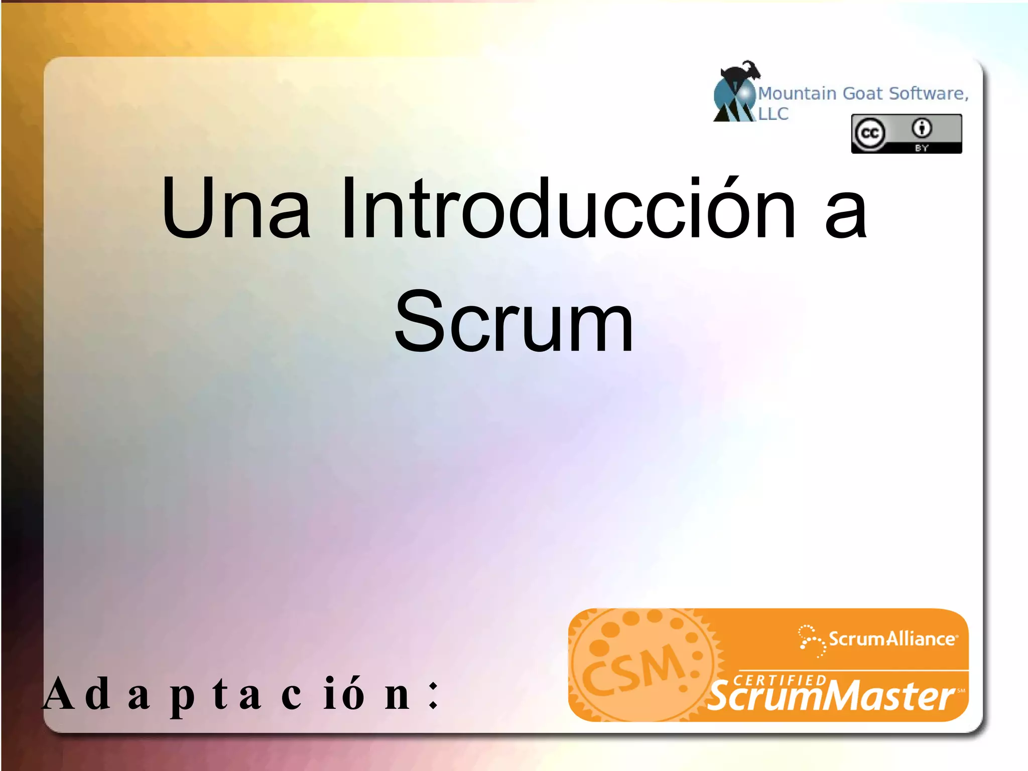 Este documento presenta una introducción a Scrum, un proceso ágil para el desarrollo de software. Explica los orígenes y principios de Scrum, incluyendo su énfasis en equipos auto-organizados, iteraciones cortas llamadas "sprints", y entregas frecuentes de software. También describe los roles, artefactos y reuniones clave de Scrum, como el Product Backlog, Sprint Backlog, Daily Scrum y reuniones de revisión y retrospectiva.