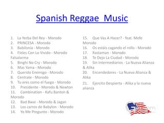 Este documento proporciona una lista de 76 canciones de reggae español de varios artistas como Morodo, Zona Ganjah, Fidel Nadal, Gondwana y Cultura Profetica. La lista incluye títulos de canciones y nombres de artistas.
