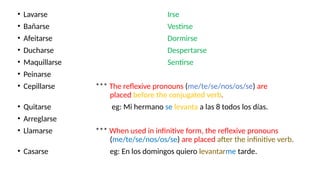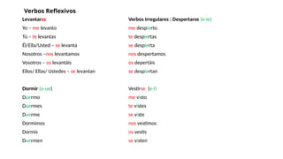 El documento aborda el uso de verbos reflexivos y verbos irregulares en español, incluyendo la conjugación y la colocación de pronombres reflexivos. También se explica el uso del verbo 'gustar' junto con pronombres de objeto indirecto, y se incluyen ejemplos de oraciones. Además, se analizan los adjetivos y adverbios relacionados con la intensidad y la cantidad, como 'muy' y 'mucho'.