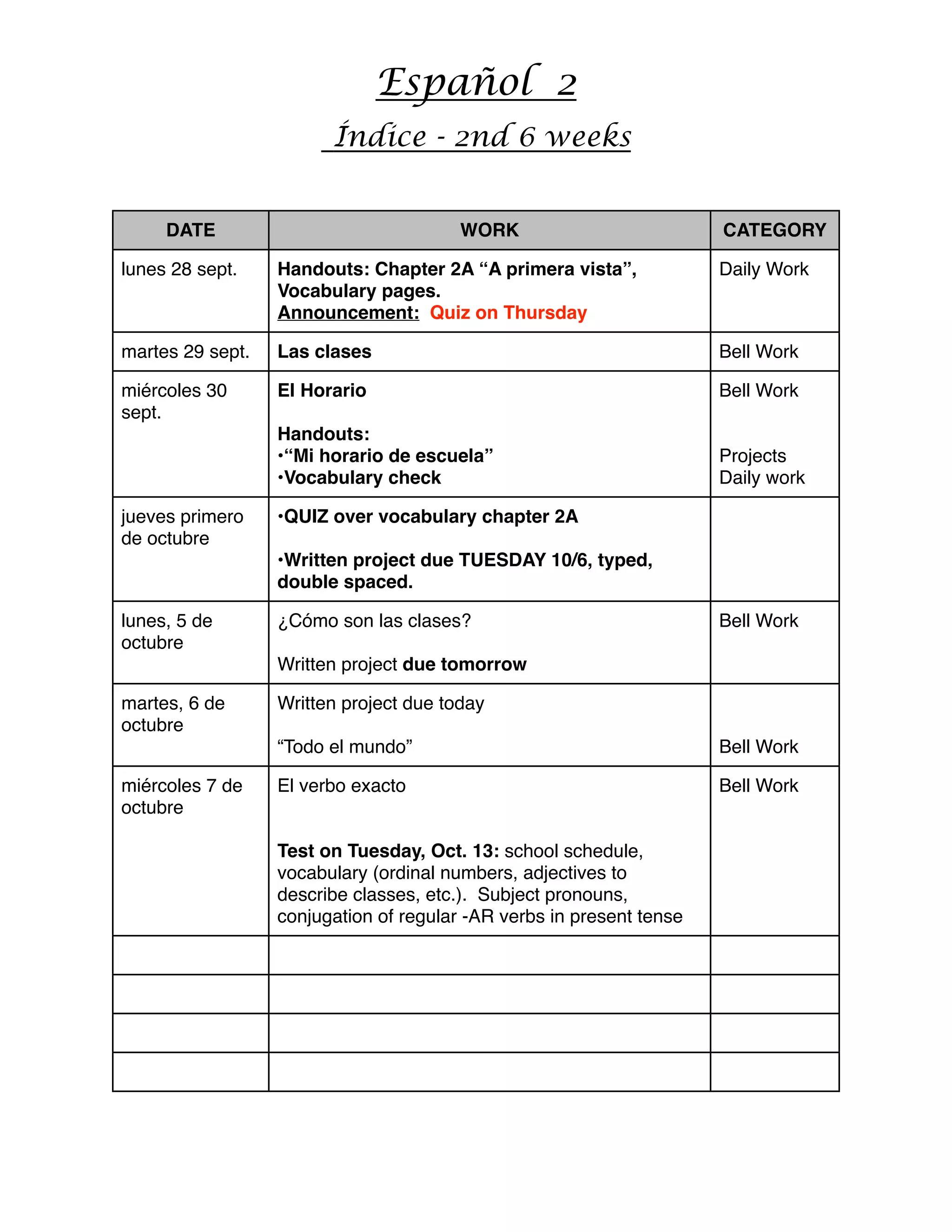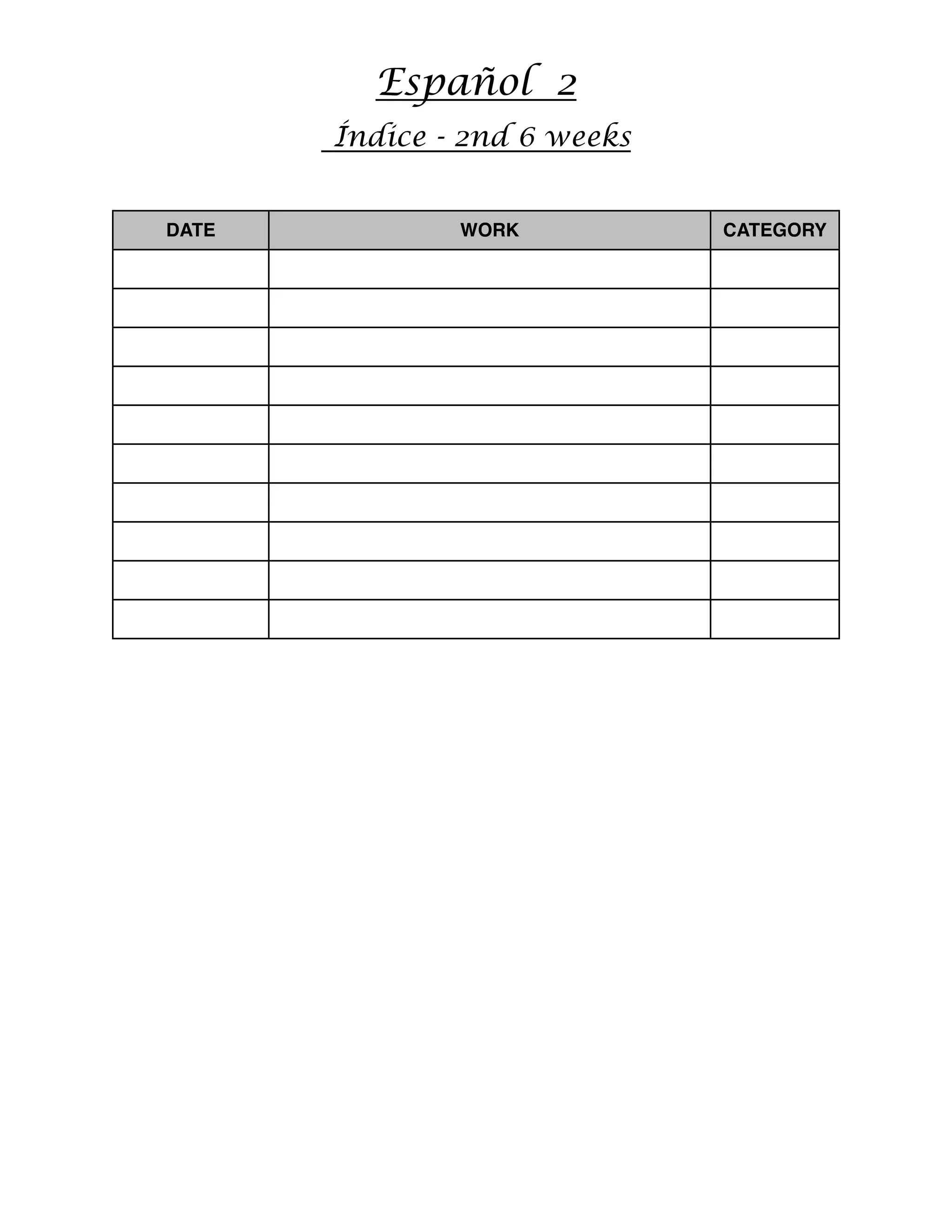 Este documento presenta el índice de trabajo para la segunda mitad del sexto período de Español 2. Incluye las fechas, tareas y categorías de trabajo como lecturas, proyectos escritos, exámenes de vocabulario y conjugación de verbos durante las próximas 3 semanas de clase.