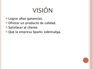 La empresa Sparks busca lograr altas ganancias y satisfacer a los clientes ofreciendo un producto de calidad para sobresalir entre la competencia. Su misión es vender grandes cantidades de su producto, elaborado con buenos materiales, para satisfacer las expectativas de los clientes a través de la calidad, lo que hará que los primeros compradores se conviertan en multiplicadores que impulsarán el éxito de la empresa. Su objetivo es ofrecer llaveros modernos que permitan a los jóvenes expresar su personalidad. Sus valores fundamentales