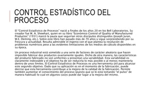 El control estadístico de procesos nació en los años 20 para reducir la variabilidad natural en los procesos industriales y mantener las características de los productos dentro de límites aceptables. Monitorea el centro y variación del proceso a través de gráficos para distinguir variaciones normales de eventos importantes y mejorar la calidad y conocimiento del proceso. Conceptos clave incluyen mejora continua a través del control del proceso para prevenir defectos debido a la variabilidad inherente en todo proceso.