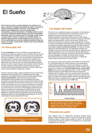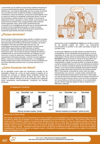 El documento describe las etapas del sueño y cómo funciona el ritmo circadiano. Explica que el cerebro pasa por etapas de sueño lento y REM durante la noche, y que el núcleo supraquiasmatico en el hipotálamo actúa como un reloj biológico que controla el patrón de sueño y vigilia. También describe experimentos que muestran la importancia del sueño para la recuperación del cerebro y la consolidación de la memoria.