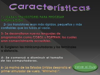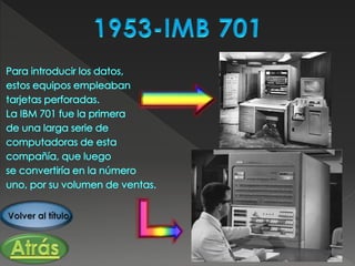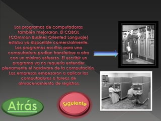 El documento resume brevemente la historia de las computadoras desde los primeros dispositivos mecánicos como el ábaco y la Pascalina hasta el desarrollo de las computadoras electrónicas como la ENIAC y la EDVAC. También describe algunas de las primeras computadoras comerciales como el UNIVAC y la introducción de los circuitos integrados que llevaron a las computadoras personales.
