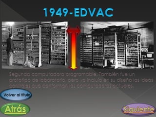 El documento resume la historia de las computadoras desde los primeros dispositivos mecánicos como el ábaco y la Pascalina hasta el desarrollo de las computadoras electrónicas modernas. Destaca invenciones clave como la máquina analítica de Charles Babbage, el uso de tarjetas perforadas por Herman Hollerith, la ENIAC como primera computadora electrónica y el desarrollo del microprocesador en los años 1970 que llevó a las computadoras personales. Explica las diferentes generaciones de computadoras y sus características técn