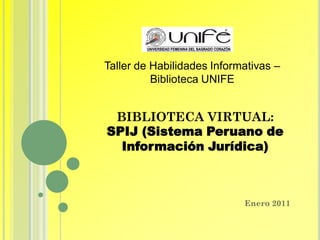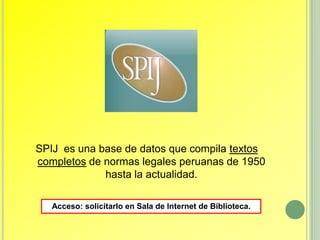 El documento proporciona instrucciones sobre cómo acceder y utilizar la base de datos SPIJ (Sistema Peruano de Información Jurídica), que contiene textos completos de normas legales peruanas desde 1950 hasta la actualidad. Explica que los usuarios deben solicitar acceso en la sala de internet de la biblioteca de UNIFE y luego podrán buscar normas por número, tema o fecha de publicación después de iniciar sesión con un usuario y contraseña en la página web de SPIJ.