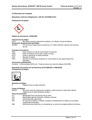 Este documento proporciona información de seguridad sobre el producto SPINTORTM 480 SC Insect Control. Contiene espinosad como ingrediente activo y está clasificado como tóxico para el medio ambiente acuático. Se proporcionan instrucciones sobre el almacenamiento, manipulación, primeros auxilios y equipo de protección personal para su uso seguro. El documento también incluye detalles sobre la composición del producto, identificación de peligros, medidas de lucha contra incendios y derrames accidentales.