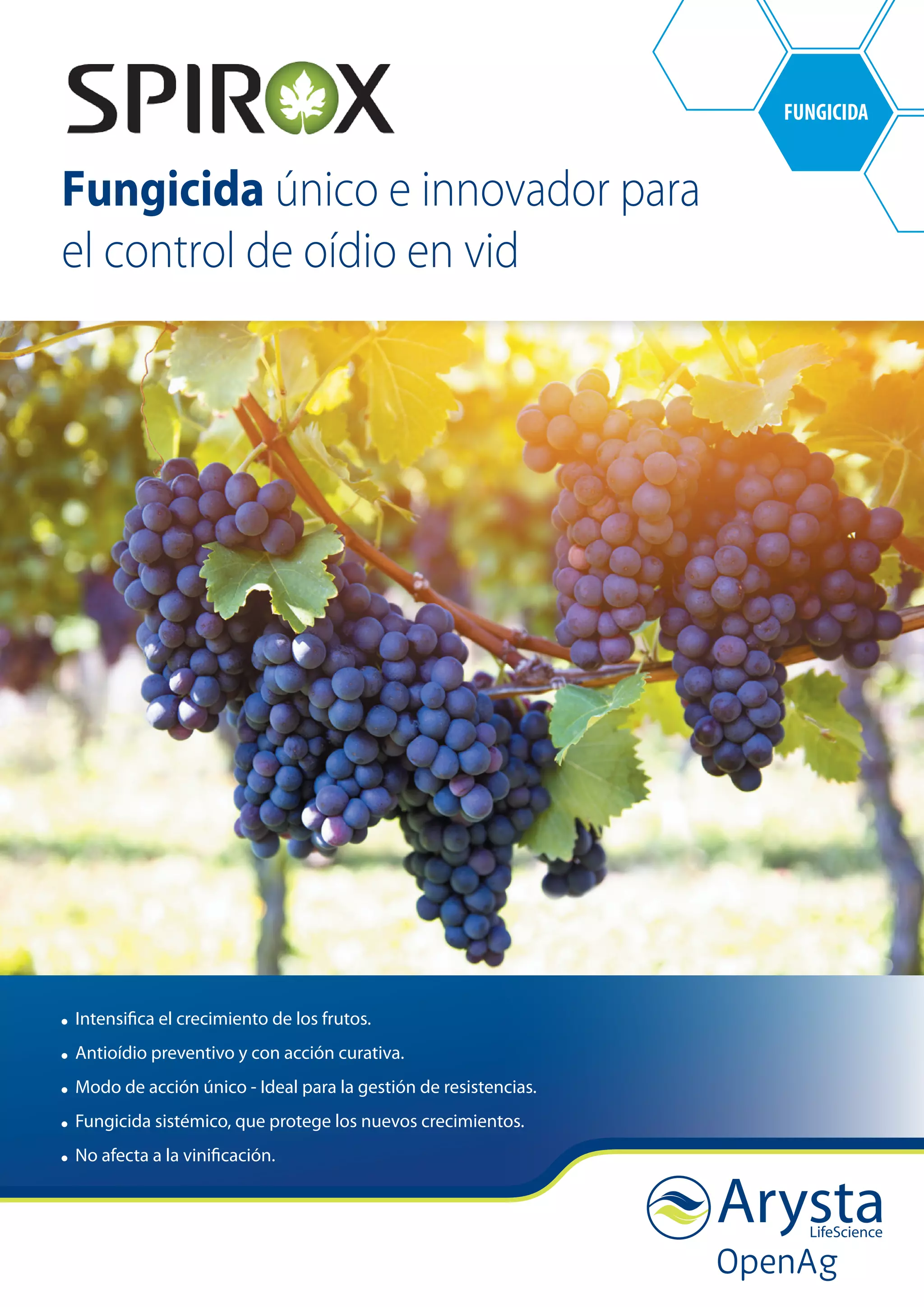 Spirox 500 EC es un fungicida sistémico para el control de oídio de la vid. Contiene Espiroxamina como sustancia activa, la cual pertenece a una nueva familia química y actúa de forma única inhibiendo enzimas en 4 puntos de la biosíntesis del ergosterol fúngico. Spirox 500 EC tiene efecto preventivo, curativo y erradicante sobre el oídio, controlándolo en todas las etapas de su desarrollo, y no afecta la vinificación. Las pruebas m