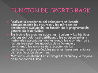 El documento describe las responsabilidades de una entrenadora de baloncesto, incluyendo enseñar técnicas y tácticas básicas del deporte, motivar el progreso de los estudiantes, enseñar las reglas y transmitir valores a través de la práctica del deporte. También detalla que la entrenadora se encarga de la formación técnica y táctica de los equipos, así como de su gestión y control para mantener el prestigio de la empresa deportiva.