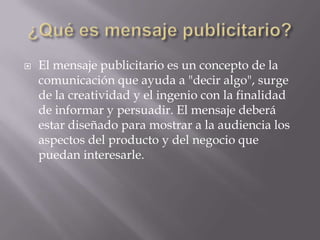 El documento define el mensaje publicitario como un concepto de comunicación que ayuda a transmitir una idea con el fin de informar y persuadir a la audiencia sobre los aspectos de un producto o negocio que puedan interesarles. Explica que el mensaje publicitario incluye textos, imágenes, sonidos y símbolos y debe captar la atención y comunicar efectivamente la idea del objetivo publicitario. Además, señala que las características principales de un mensaje son la estrategia, la creatividad y la ejecución.