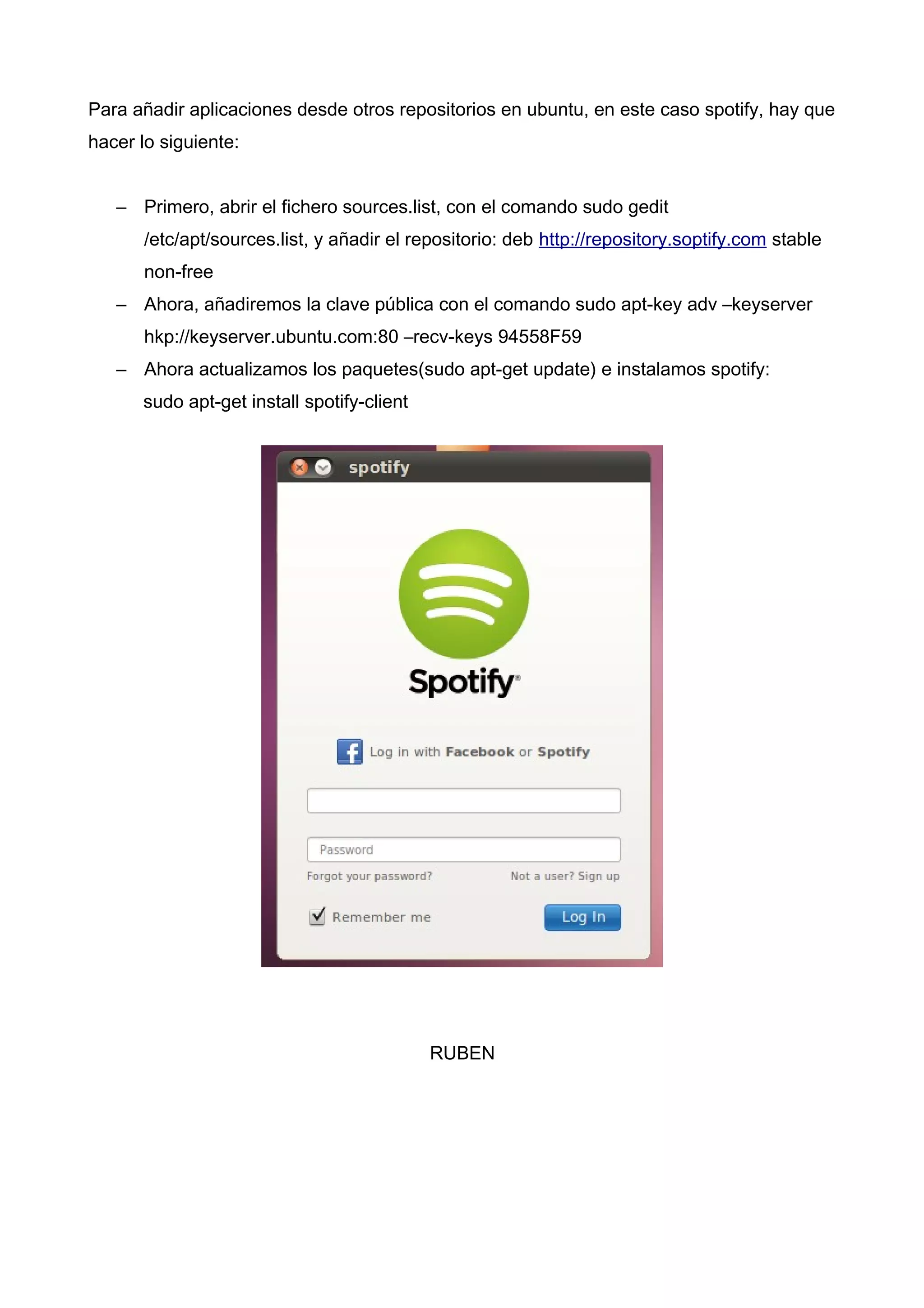 Para instalar Spotify en Ubuntu, se debe editar el archivo sources.list para agregar el repositorio de Spotify, agregar su clave pública, actualizar los paquetes e instalar Spotify-client con los comandos sudo apt-get update y sudo apt-get install spotify-client.