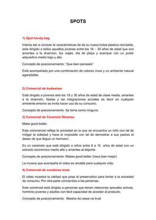 Este documento presenta 8 spots publicitarios de diferentes marcas. Cada spot describe brevemente el concepto, a quién va dirigido y su posicionamiento. Los spots promueven productos como bolsas, cervezas, dulces, preservativos, trenes hotel, automóviles y bebidas, y están dirigidos a distintos grupos como jóvenes, familias, ejecutivos y amantes de los deportes.