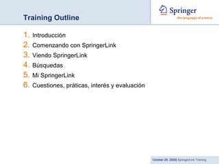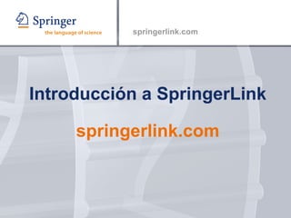El documento proporciona una introducción a SpringerLink, incluyendo una descripción general del recurso, cómo iniciar sesión y navegar por el contenido. Explica las diferentes opciones de búsqueda como búsqueda básica, avanzada y booleana, y cómo personalizar los resultados guardando artículos y configurando alertas.