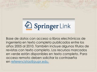 El documento detalla el programa de desarrollo de destrezas de información de la Universidad Politécnica de Puerto Rico, que ofrece acceso a una base de datos de libros electrónicos y revistas de ingeniería publicados entre 2005 y 2010. Se proporciona información sobre cómo acceder a los recursos en línea, incluyendo pasos para utilizar la base de datos SpringerLink. Para más asistencia, se puede contactar al personal de la biblioteca a través de varios medios.