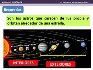 El documento describe los ocho planetas del Sistema Solar, dividiéndolos en planetas interiores y exteriores. Explica que los planetas interiores son más pequeños y rocosos, mientras que los planetas exteriores son más grandes y gaseosos. Luego procede a detallar las características fundamentales de cada planeta, incluyendo su composición atmosférica, temperatura superficial, rotación, presencia de satélites y otras propiedades distintivas.