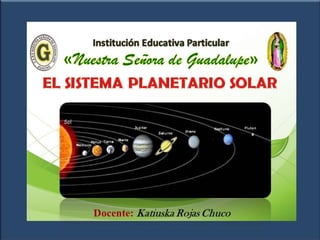 Nuestro Sistema Planetario Solar se encuentra en el Brazo de Orión de la Vía Láctea. Se formó a partir de una nube interestelar que se contrajo y giró rápidamente, formando un disco plano del que se generaron los planetas en la parte externa y el Sol en el centro. Está formado por el Sol, 8 planetas, 64 satélites y un cinturón de asteroides.