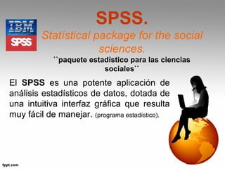 Este documento presenta el programa SPSS (Statistical Package for the Social Sciences), un potente programa de análisis estadístico de datos. Describe las funciones de SPSS, incluyendo la administración y análisis de grandes bases de datos, una variedad de análisis estadísticos básicos y avanzados, y la capacidad de importar y exportar datos de otros programas como Microsoft Excel. También discute algunas ventajas e inconvenientes del uso de SPSS.