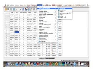 El documento describe los pasos para crear tablas de frecuencia a partir de una matriz de datos: 1) Seleccionar "Analizar", "Estadísticos descriptivos" y "Frecuencias"; 2) Elegir las variables que se desean estudiar, como sexo, edad, nivel de estudios, talla o trabajo; 3) Seleccionar los estadísticos relevantes para cada variable.