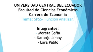 Este documento describe la función Analizar en SPSS, la cual permite realizar diversos cálculos estadísticos con una base de datos. Entre los análisis descritos se encuentran el modelo lineal general, regresión, pruebas paramétricas y no paramétricas como chi-cuadrado y Wilcoxon. El documento también explica conceptos como variables dependientes, independientes, y cómo formular hipótesis nulas y alternativas.