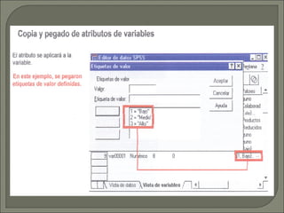 Este documento presenta un curso básico sobre el uso del paquete estadístico SPSS 15.0 en español. Explica las ventanas y herramientas del programa, así como su aplicación para realizar análisis estadísticos. El objetivo del curso es entrenar a los participantes en los principios básicos de SPSS y su aplicación en estadística.