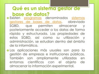 El documento proporciona información sobre los sistemas gestores de bases de datos (SGBD) y la evolución de SQL Server a través de los años. Explica que los SGBD permiten almacenar y acceder a datos de forma estructurada y eficiente. Luego describe las diferentes versiones de SQL Server desde 1988 hasta 2012, resaltando las mejoras y nuevas funcionalidades incorporadas en cada versión.