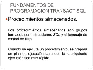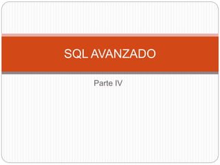 El documento aborda los procedimientos almacenados en SQL avanzado, que son grupos de instrucciones SQL y control de flujo, permitiendo ejecutar operaciones de manera eficiente. Se presentan ejemplos sobre la creación de procedimientos con y sin parámetros de entrada, así como la modificación y eliminación de los mismos. Además, se menciona la capacidad de los procedimientos para devolver valores y manipular datos mediante operaciones de actualización.