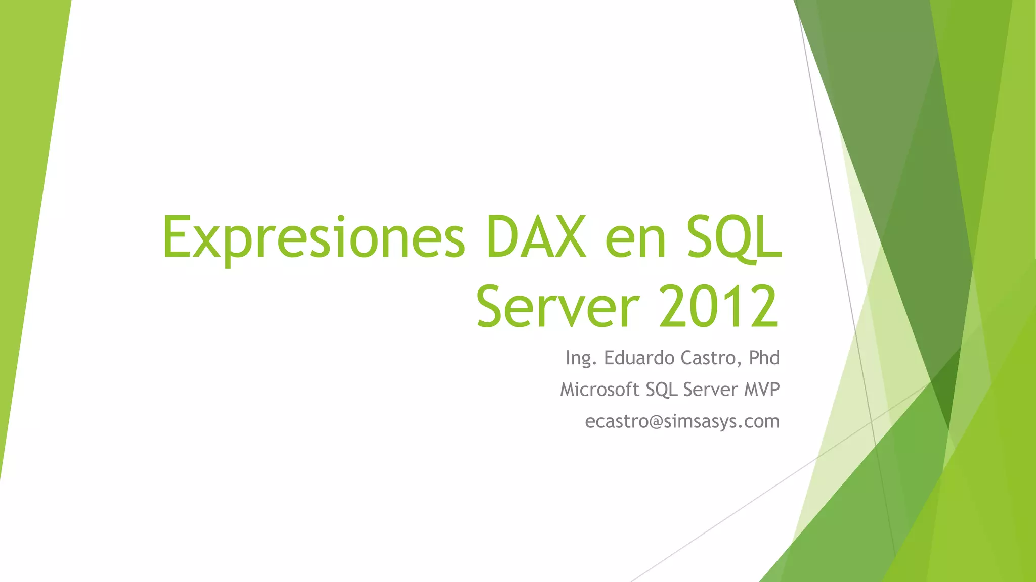 Este documento describe las expresiones DAX en SQL Server 2012. Explica que DAX se utiliza en PowerPivot y Analysis Services para crear medidas y columnas calculadas. También describe las mejoras de DAX en SQL Server 2012 como funciones adicionales y soporte para modelos de datos más complejos. El documento concluye explicando cómo los profesionales de TI pueden usar DAX en SQL Server Data Tools y SQL Server Management Studio.