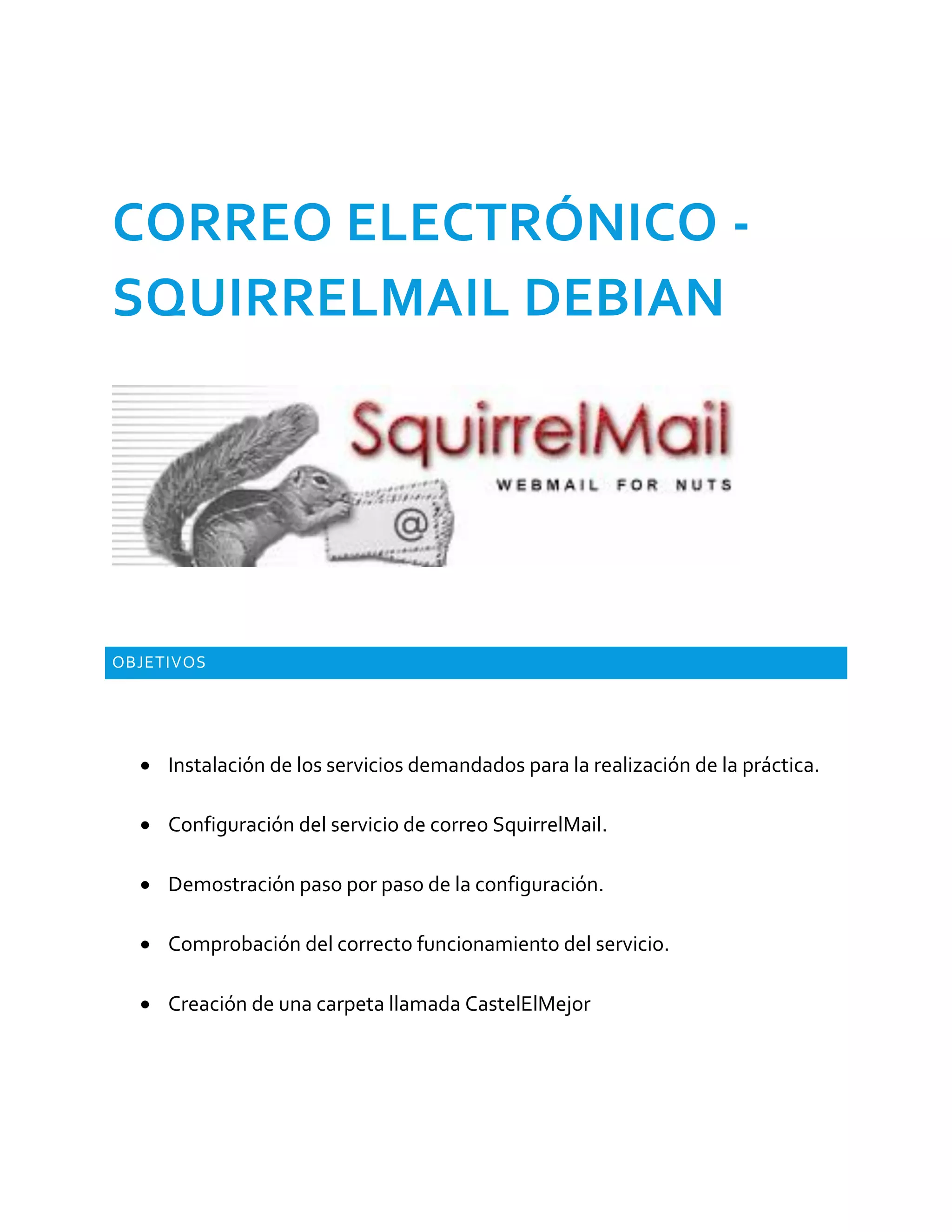 Este documento describe la instalación y configuración de SquirrelMail en Debian para proporcionar servicios de correo electrónico. Explica cómo instalar y configurar Postfix, Dovecot, Bind9 y SquirrelMail, y comprueba que el correo electrónico funciona correctamente al enviar un mensaje entre dos usuarios creados.