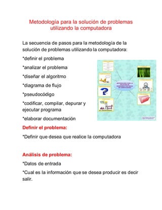 El documento describe los pasos de la metodología para resolver problemas utilizando la computadora, incluyendo definir el problema, analizarlo, diseñar un algoritmo y diagrama de flujo, codificar el programa, compilarlo y depurarlo, ejecutarlo, y elaborar documentación. Explica cada paso en detalle, como definir los datos de entrada y salida, los métodos necesarios, y escribir el código basado en el diagrama de flujo. También cubre compilar el código para traducirlo al lenguaje de la máquina y ej